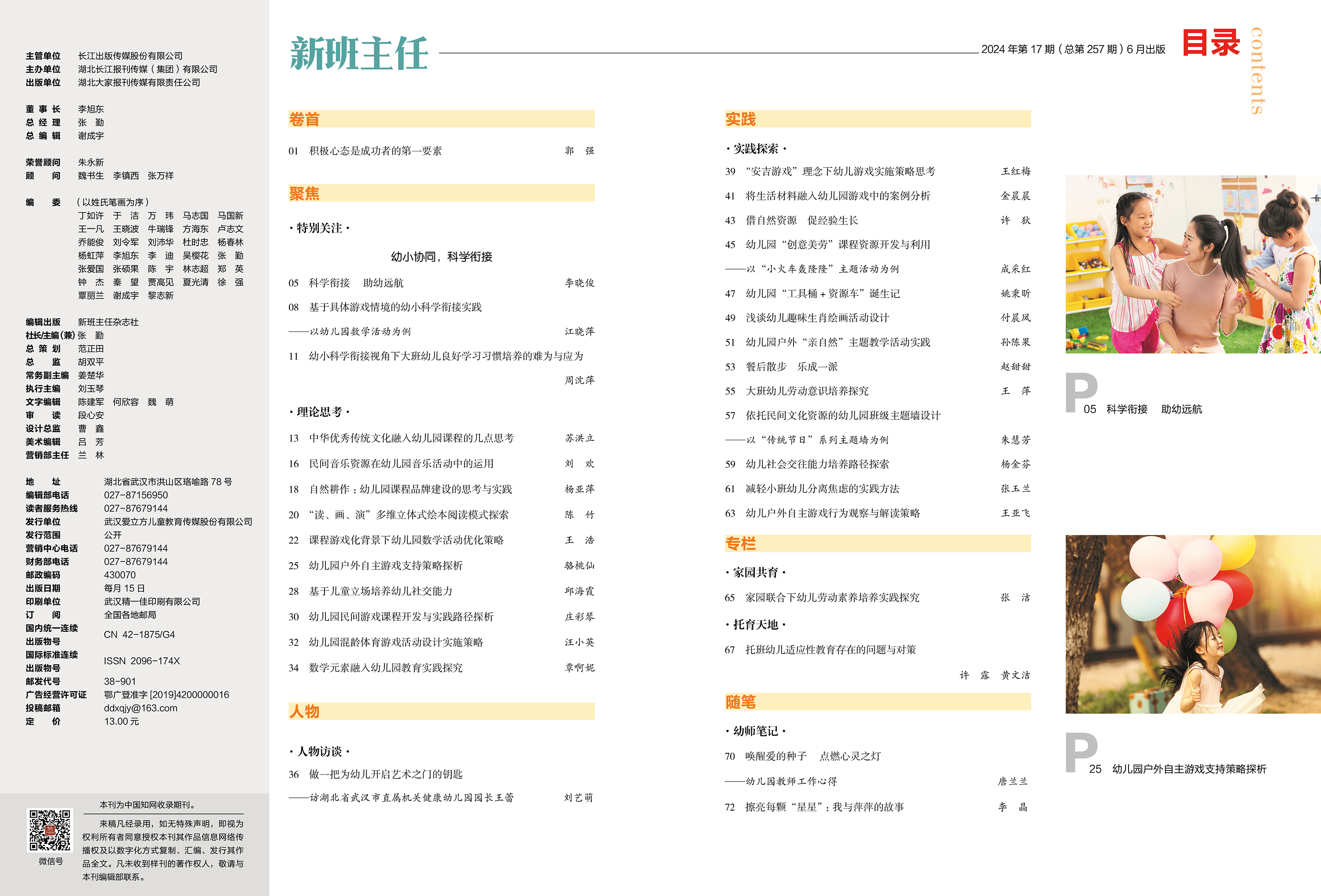 P01 郭 强 积极心态是成功者的第一要素 P05 李晓俊 科学衔接 助幼远航 P13 苏洪立 中华优秀传统文化融入幼儿园课程的几点思考 P40 刘艺萌 做一把为幼儿开启艺术之门的钥匙 ——访湖北省武汉市直属机关健康幼儿园园长王蕾 P39 王红梅 “安吉游戏”理念下幼儿游戏实施策略思考